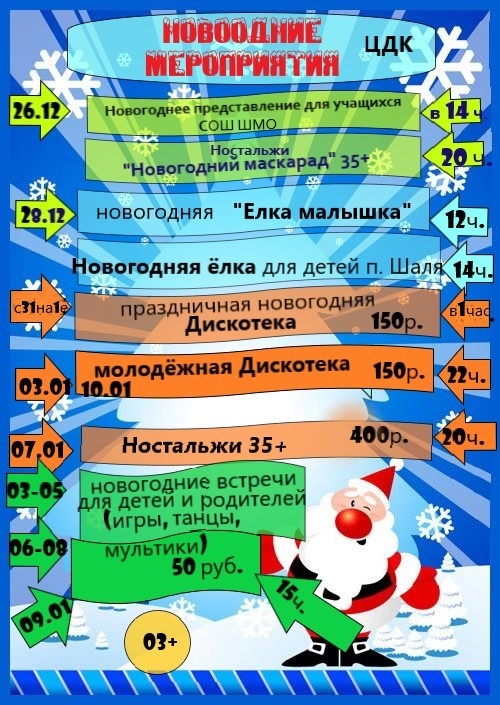 Остальные ключевые мероприятия состоятся в Центральном доме культуры. В новогоднюю ночь с 31 декабря на 1 января работники культуры устроят для шалинцев праздничную новогоднюю дискотеку. Начало в 01:00, стоимость входного билета – 150 рублей. А 3 и 10 января в 22:00 состоятся молодежные дискотеки, цена аналогична.